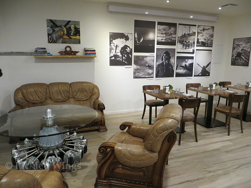 The lounge also features a leather sofa and chair set that surround a coffee table that uses a radial aircraft engine for a base. There are also some pub type tables around and some evocative black and white period photographs on the walls.