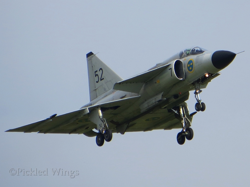As for flying examples of the Viggen, an AJS 37 and SK 37E are kept in airworthy condition by the Swedish Air Force Historic Flight and visit airshows around Europe during the airshow season.